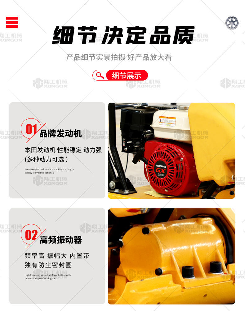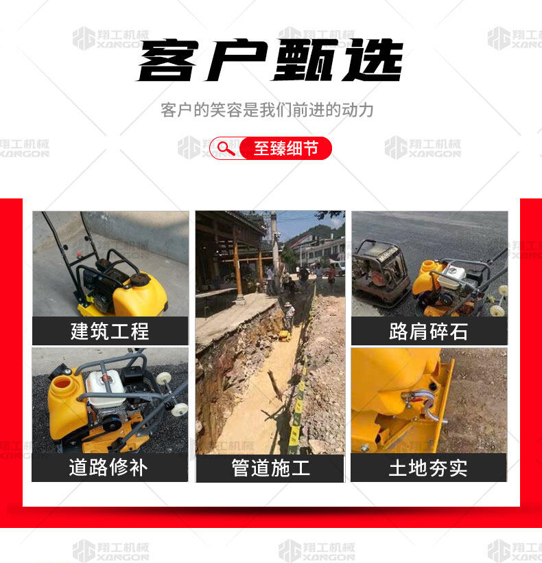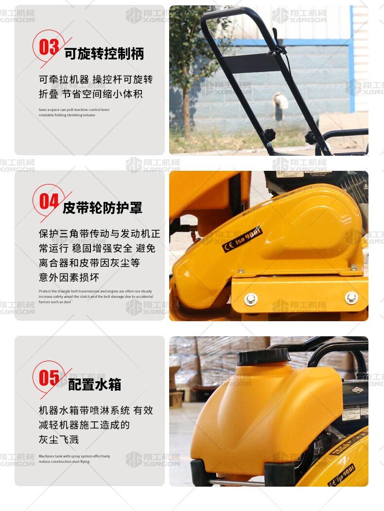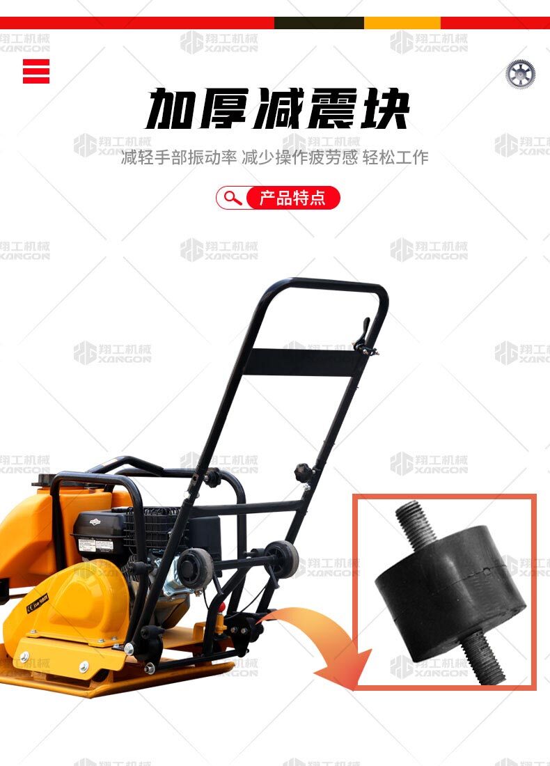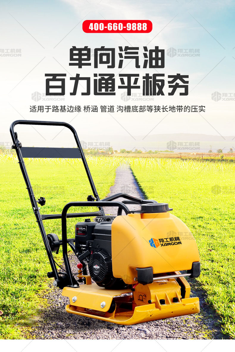 單向平板夯XPB-20適用于路基邊緣、橋涵、管道、溝槽底部等狹長地帶的壓實(shí)。 HONDA動(dòng)力,性能優(yōu)越,啟動(dòng)容易 采用單獨(dú)懸掛式強(qiáng)力減震機(jī)構(gòu),減少對發(fā)動(dòng)機(jī)的沖擊,提高操作人員的舒服感;