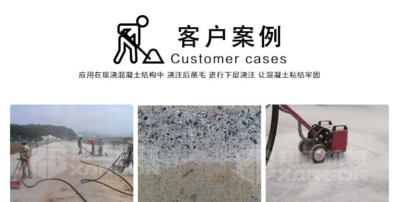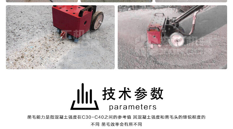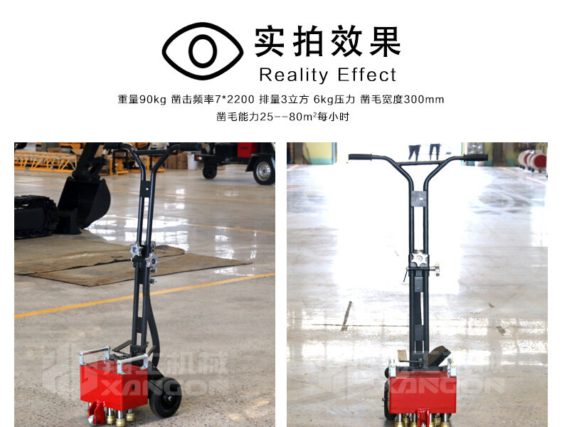 XG-Q7A手推式面鑿毛機(jī),主要為高速公路、高速鐵路的橋面、機(jī)場(chǎng)、橋梁、停車場(chǎng)等各種混凝土地面新建鋪裝時(shí)對(duì)地面表層混凝土浮漿的去除,達(dá)到均勻粗糙而設(shè)計(jì)的。對(duì)各種陳舊地面做翻新前的地坪處理;去除破損地面凸起部分;環(huán)氧樹脂地面鑿毛;地面做防滑面;對(duì)需二次鋪裝新舊面層打毛等具卓效的鑿毛工具。重量90kg,鑿擊頻率7*2200,排量壓力3立方6kg壓力,鑿毛寬度300mm,鑿毛能力25--80平方每小時(shí)(根據(jù)施工要求如混凝土標(biāo)號(hào)、鑿深等)。