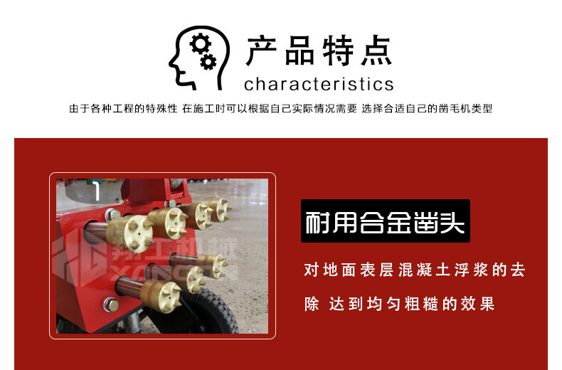XG-Q7A手推式地面鑿毛機(jī),主要為高速公路、高速鐵路的橋面、機(jī)場(chǎng)、橋梁、停車場(chǎng)等各種混凝土地面新建鋪裝時(shí)對(duì)地面表層混凝土浮漿的去除,達(dá)到均勻粗糙而設(shè)計(jì)的。