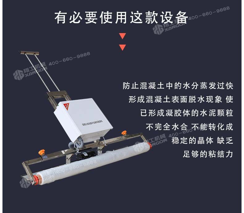 混凝土澆注后,如果養(yǎng)護(hù)不及時就容易產(chǎn)生一些不良效果,如氣候炎熱、空氣干燥等情況,我們就有必要使用這款設(shè)備,防止混凝土中的水分蒸發(fā)過快,形成混凝土表面脫水現(xiàn)象,使已形成凝膠體的水泥顆粒不完全水合,不能轉(zhuǎn)化成穩(wěn)定的晶體,缺乏足夠的粘結(jié)力。因此,混凝土表面會出現(xiàn)剝落或粉粒脫落。另外,當(dāng)混凝土強(qiáng)度不夠時,過早蒸發(fā)水分會產(chǎn)生較大的收縮變形和干縮裂縫。因此,混凝土澆筑后的初期養(yǎng)護(hù)非常重要,終凝后應(yīng)立即進(jìn)行養(yǎng)護(hù)。