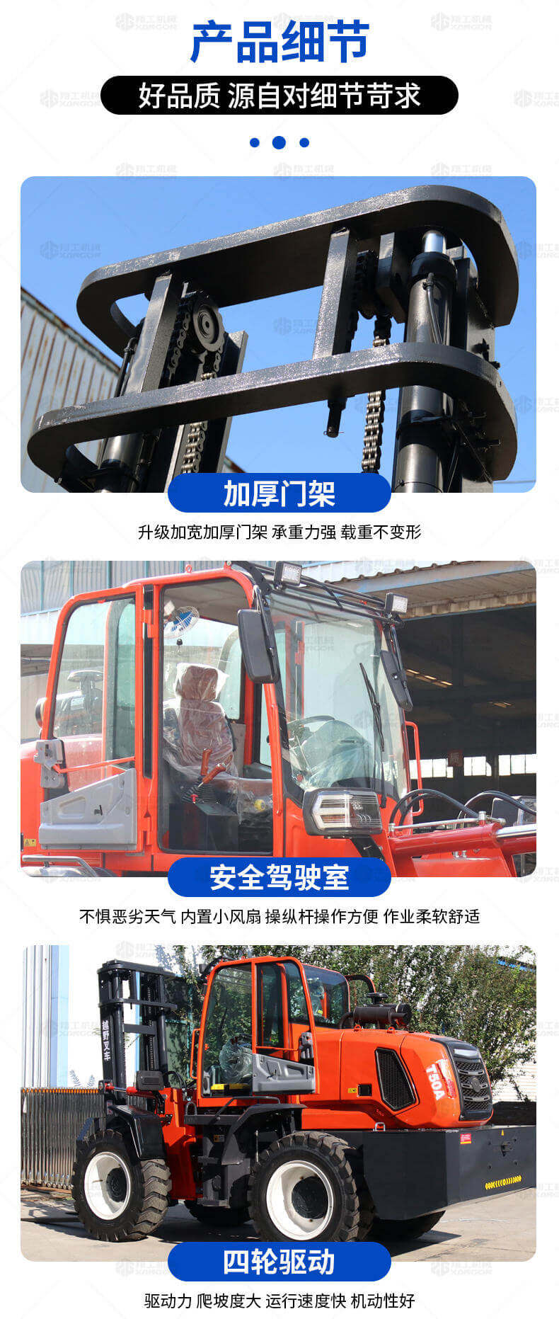 越野叉車可以在坡地和不平地面上進(jìn)行貨物裝、卸、堆垛及搬運(yùn)作業(yè),具有良好的機(jī)動(dòng)性、越野性可靠性。其功能多樣,可搭配側(cè)移器、調(diào)距叉、旋轉(zhuǎn)器、軟包夾、推出器、側(cè)翻叉、側(cè)翻斗、起重臂等工具完成不同的工作。