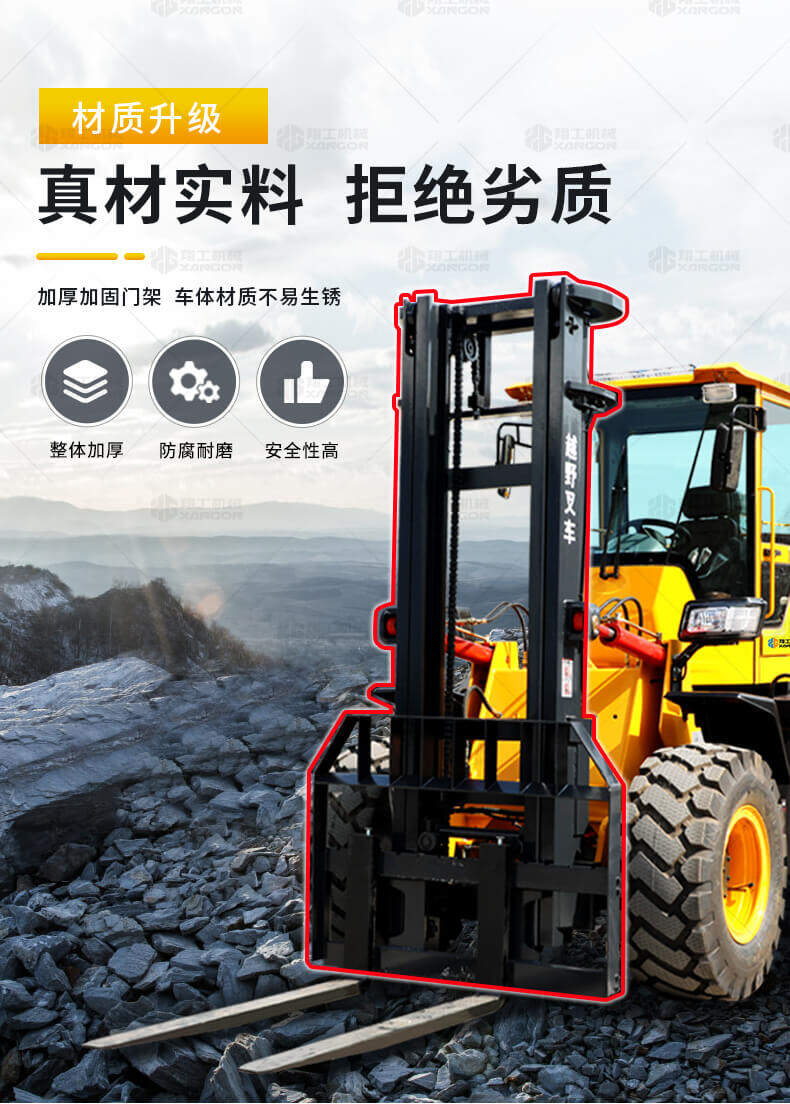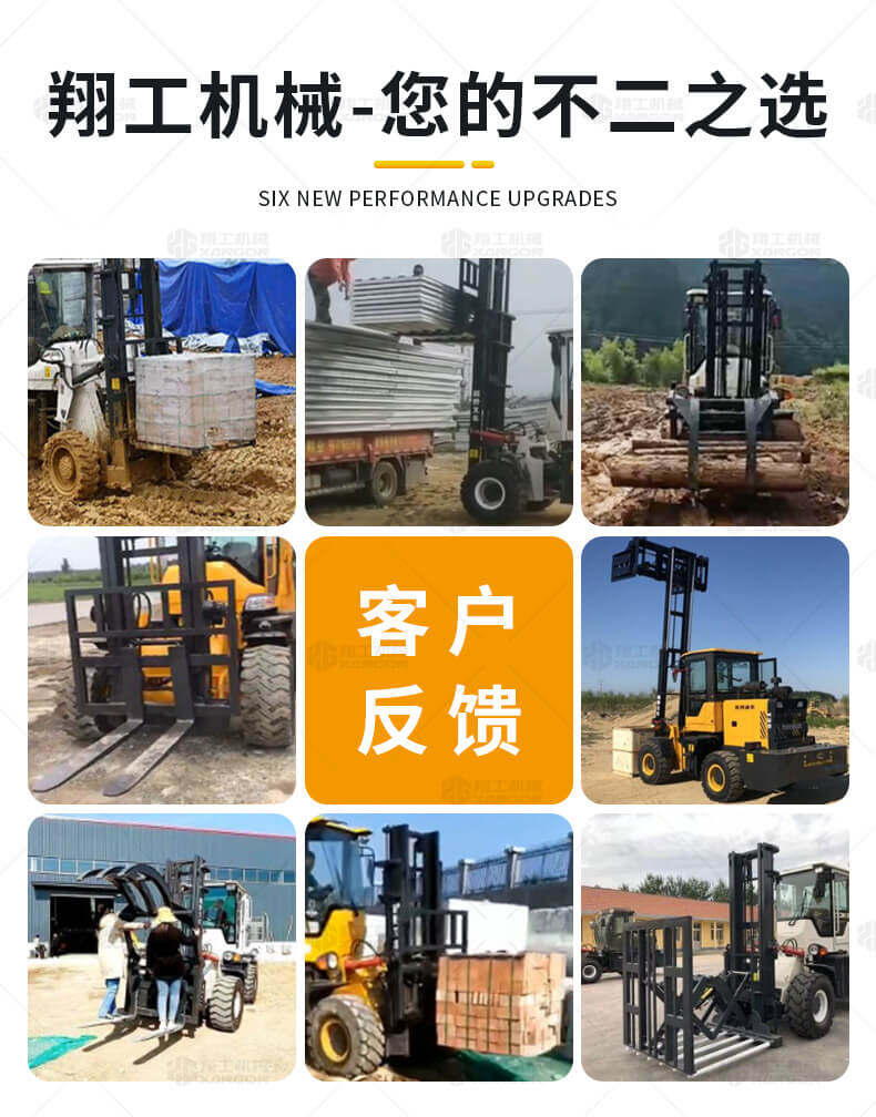 5.越野叉車發(fā)動機功率大,采用全輪驅動和越野輪胎。