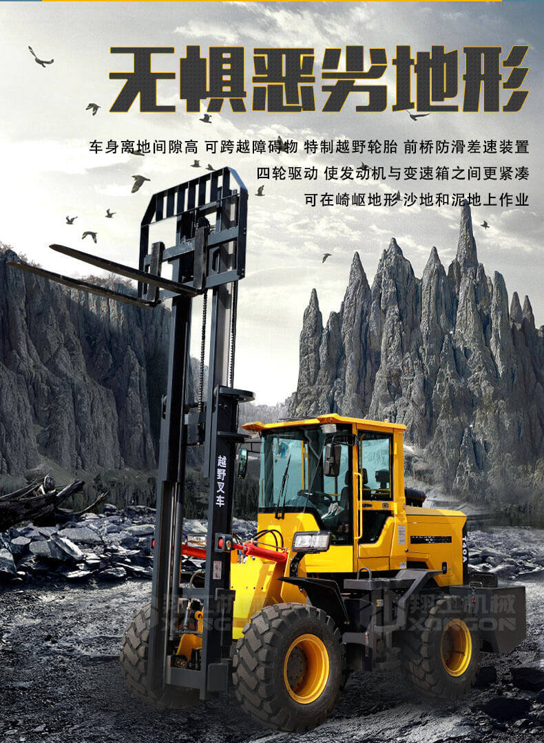 5.越野叉車(chē)發(fā)動(dòng)機(jī)功率大,采用全輪驅(qū)動(dòng)和越野輪胎。