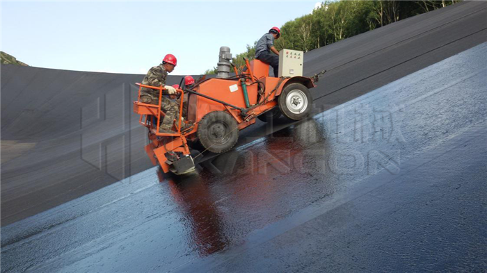 瀝青封閉層的施工采用適合于斜坡施工的專用瀝青瑪蹄脂涂刷機(jī),在牽引臺(tái)車的牽引下沿著面板從下往上涂刷。涂刷完一個(gè)條帶后,將涂刷機(jī)移動(dòng)至下一個(gè)條帶繼續(xù)涂刷。瑪蹄脂封閉層涂刷作業(yè)時(shí)環(huán)境氣溫應(yīng)在10℃以上,涂刷溫度一般在170℃~190℃;施工完成的封閉層表面禁止無關(guān)人員和機(jī)械行走;特殊部位:壩頂及曲率半徑較小的圓弧斷,采用小型機(jī)械涂刷方式進(jìn)行機(jī)械涂刷進(jìn)行,環(huán)庫水平段及弧段全部采用小刮涂機(jī)配合人工進(jìn)行刮涂施工。