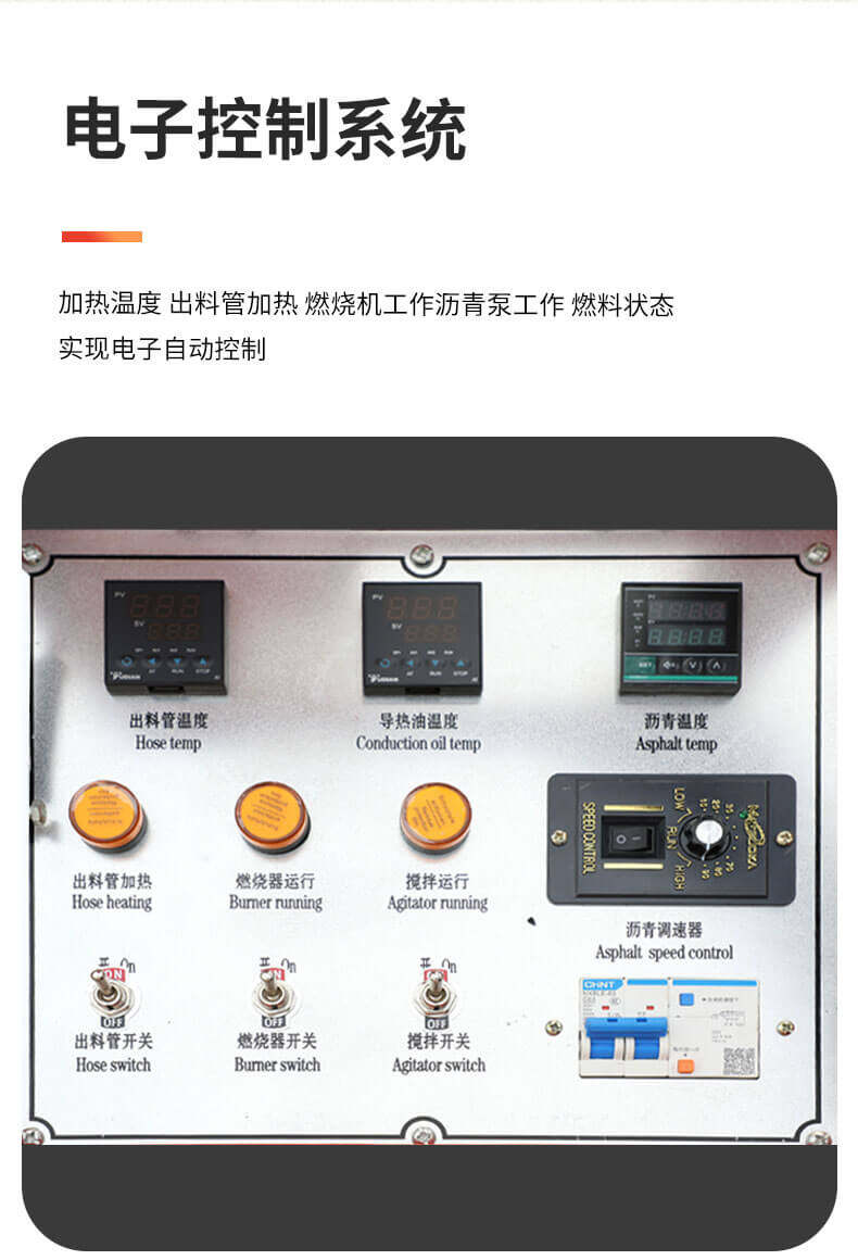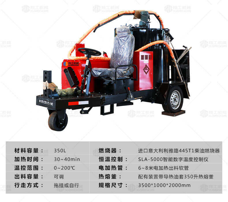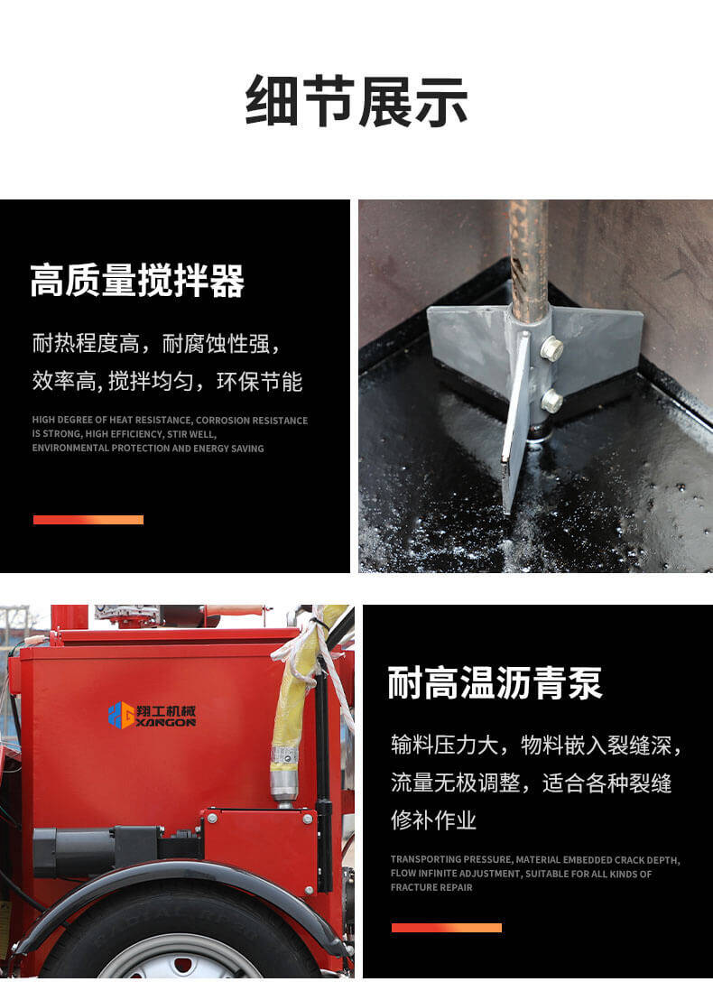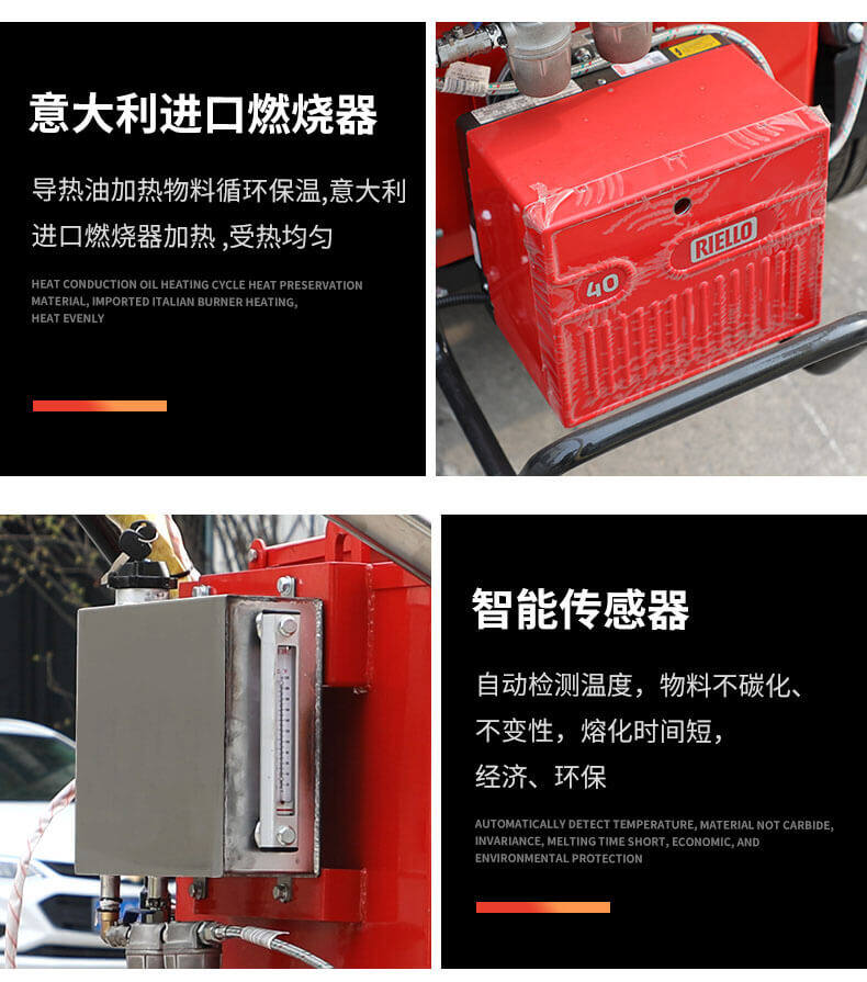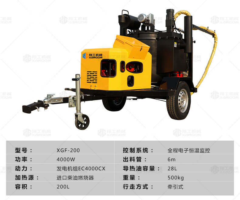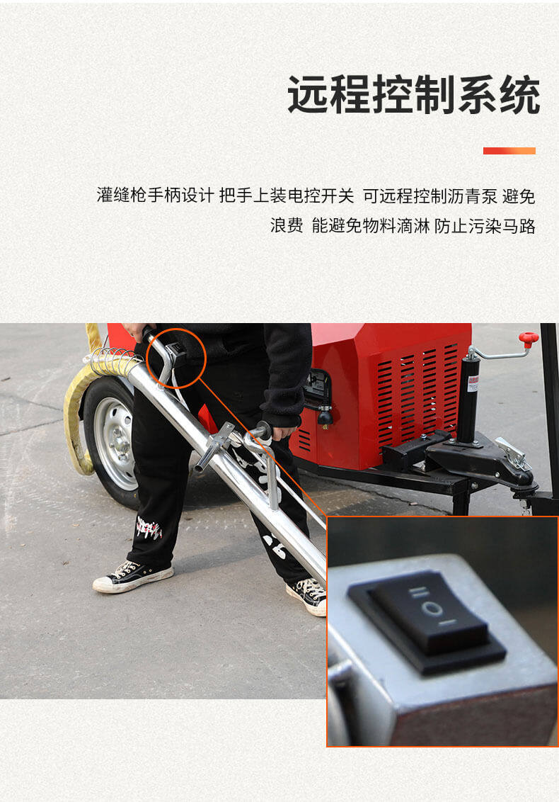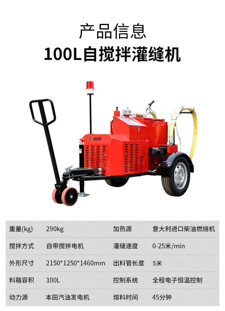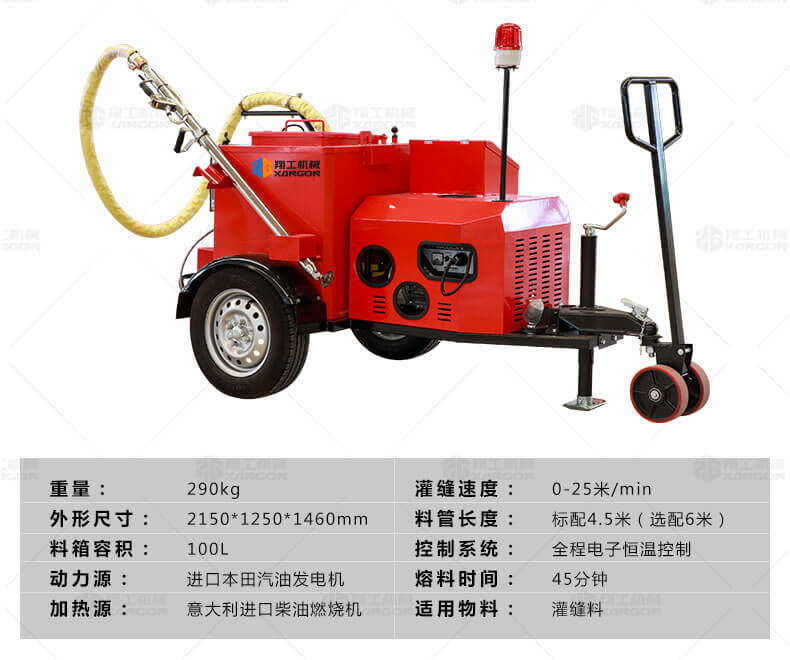 灌縫機(jī)主要有手推式和自行式手持灌縫管操作,采用進(jìn)口柴油燃燒器加熱。在工作時(shí)首先在料箱內(nèi)加入瀝青或灌縫膠,啟動發(fā)電機(jī)供電,依次間斷打開導(dǎo)熱油泵開關(guān),燃燒器開關(guān),出料管加熱開關(guān);