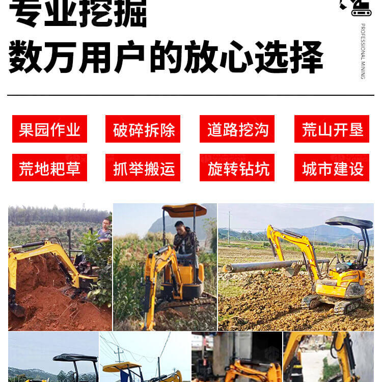 挖掘機(jī)廣泛應(yīng)用于果園苗圃、園林綠化、山地開荒、農(nóng)田改造、開挖自來水機(jī)電纜管道、室內(nèi)拆除、地面破碎、蔬菜大棚、養(yǎng)殖場、各種礦井及地道施工等。