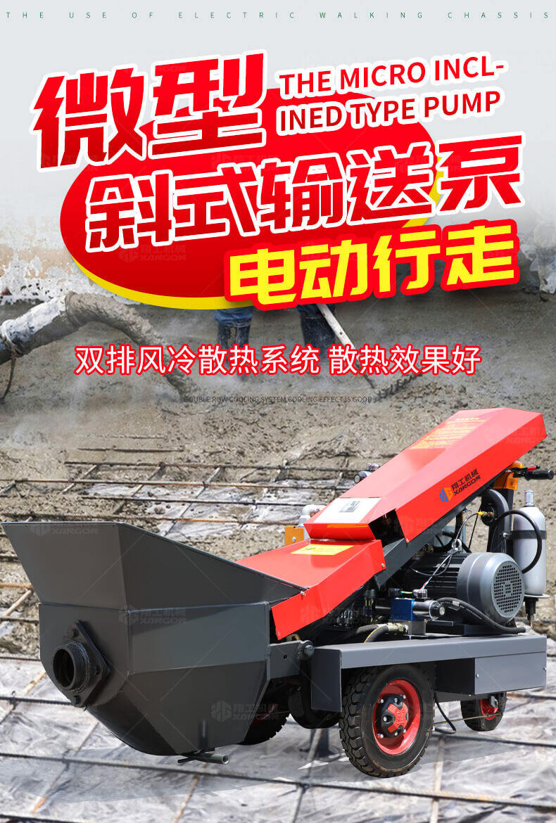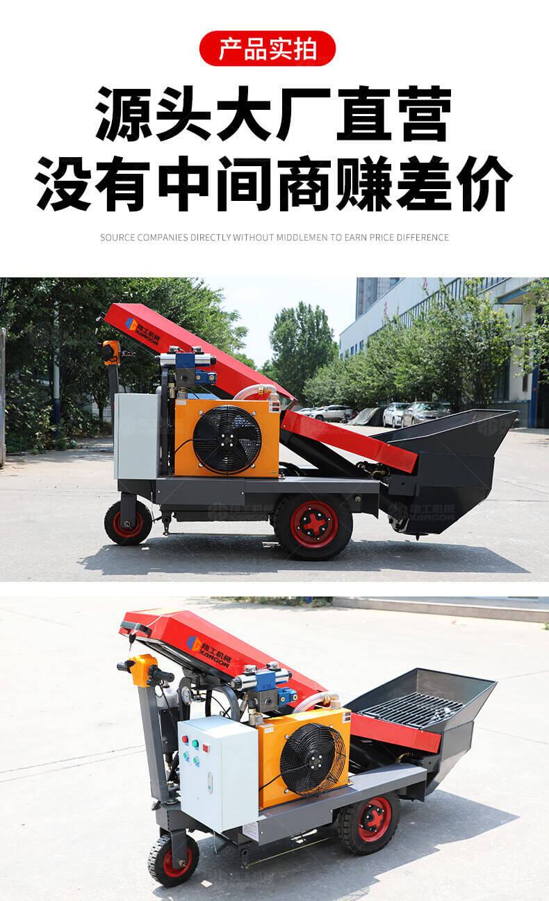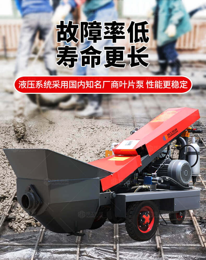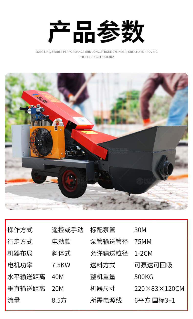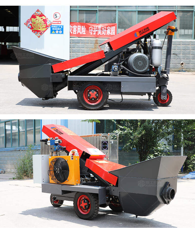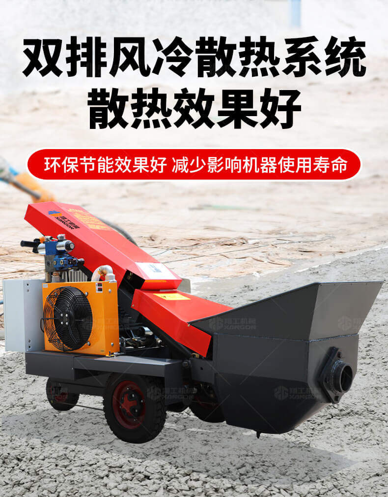 采用電動行走底盤,斜體式布局升降料斗,采用雙排風(fēng)冷散熱系統(tǒng)散熱效果更好,液壓系統(tǒng)采用國內(nèi)知名廠商葉片泵,故障率低,壽命更長,性能更穩(wěn)定,超長行程料缸大大提高了輸送效率。