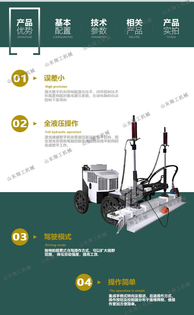 翔工機(jī)械精心研制開發(fā)的激光混凝土整平機(jī)利用先進(jìn)的激光發(fā)射接收系統(tǒng)形成的閉環(huán)回路控制整平板尺的工作,精度高,廣泛用于現(xiàn)代工業(yè)廠房、大型購物場所、貨倉及其它大面積混凝土地面施工。