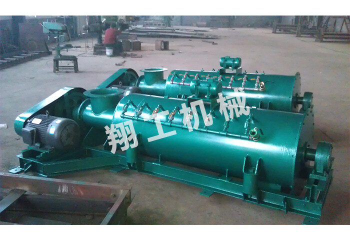 雙軸攪拌機主要由機殼、螺旋軸總成、驅(qū)動裝置、配管、蓋板、鏈罩等部件組成。