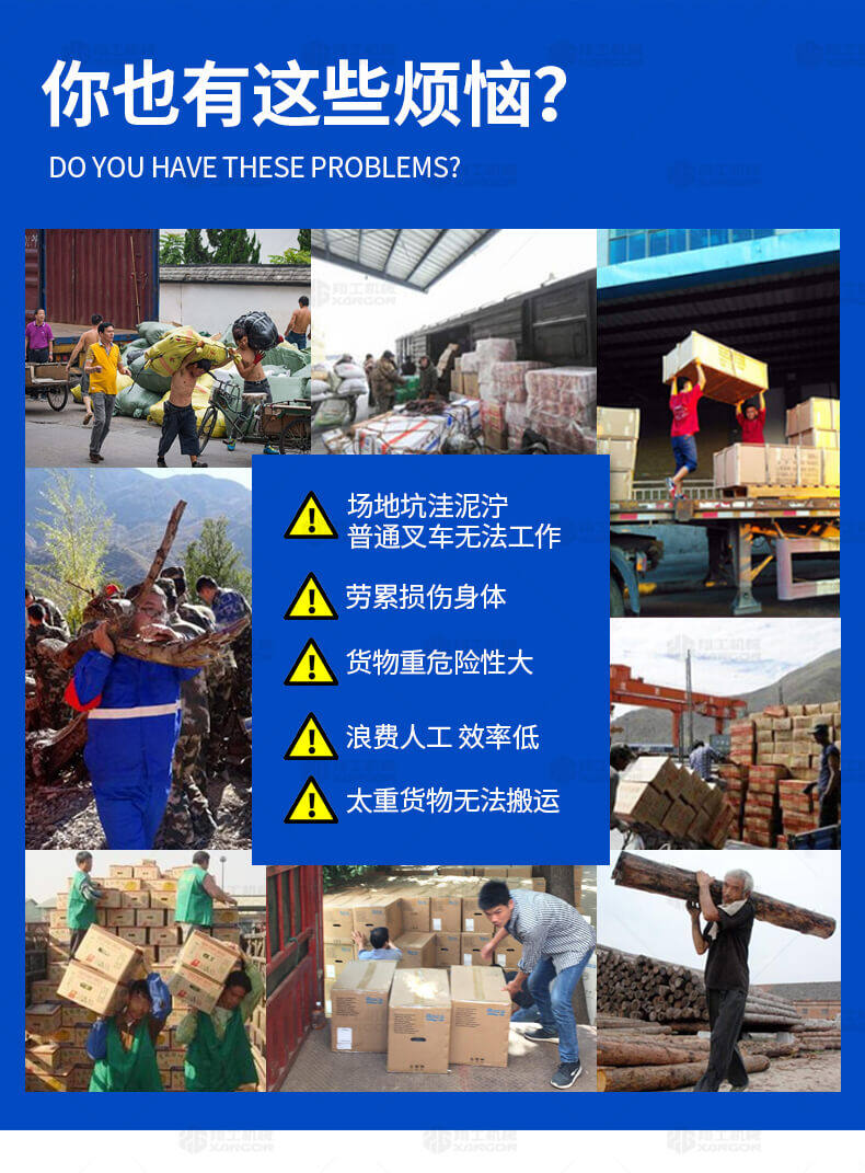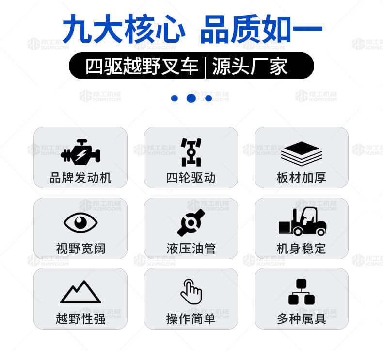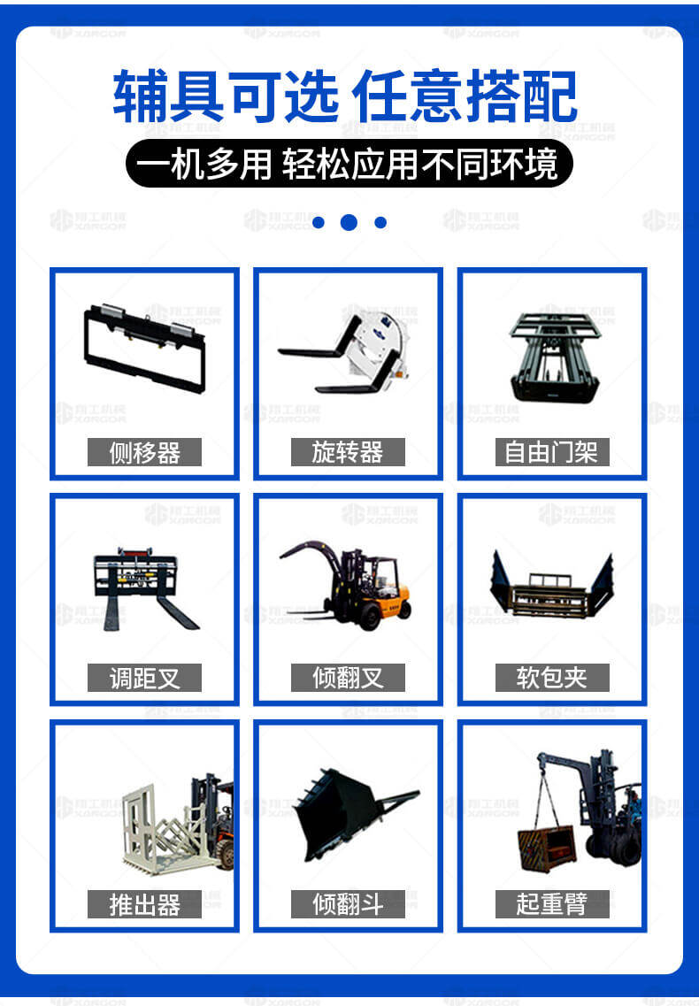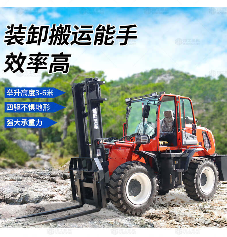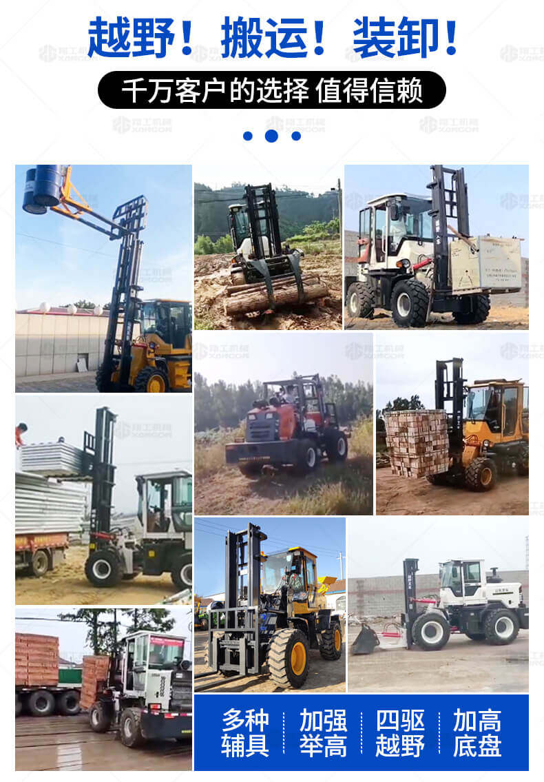 越野叉車可以在坡地和不平地面上進(jìn)行貨物裝、卸、堆垛及搬運作業(yè),具有良好的機動性、越野性可靠性。其功能多樣,可搭配側(cè)移器、調(diào)距叉、旋轉(zhuǎn)器、軟包夾、推出器、側(cè)翻叉、側(cè)翻斗、起重臂等工具完成不同的工作。